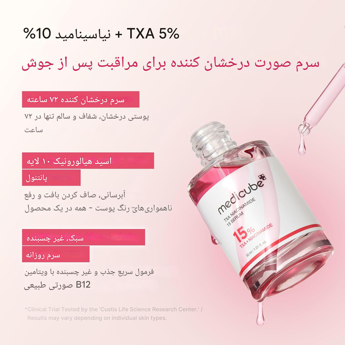 سرم نیاسینامید TXA مدی کیوب با ترکیب ۱۰ درصد نیاسینامید و ۵ درصد ترانگزامیک اسید، لکهای تیره و جای جوش را کاهش میدهد و باعث روشن و شفاف شدن پوست میشود. این سرم سبک، بدون چربی و با جذب سریع است و با ترکیباتی مانند آربوتین، گلوتاتیون و اسید هیالورونیک، پوست را آبرسانی و نرم میکند. مناسب انواع پوست بهویژه پوستهای چرب و مستعد لک.