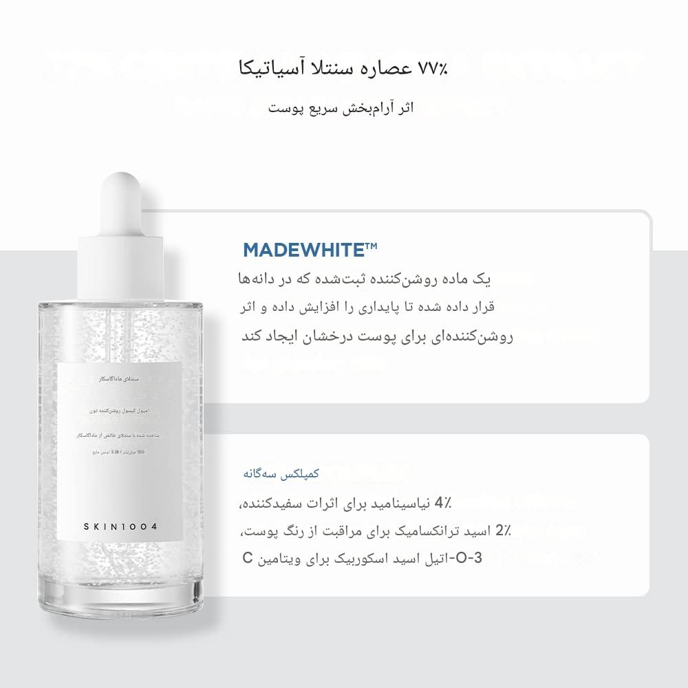 آمپول روشنکننده SKIN1004 Madagascar Centella سرمی سبک و سریعجذب است که پوست را نرم، مرطوب و شفاف میکند. با عصاره سنتلا آسیاتیکا، نیاسینامید، ترانکسامیک اسید و ویتامین C، تیرگیها و لکههای تیره کاهش یافته و رنگ پوست یکنواخت میشود. مناسب پوستهای حساس، کدر و خشک. فاقد الکل، پارابن و مواد مضر.