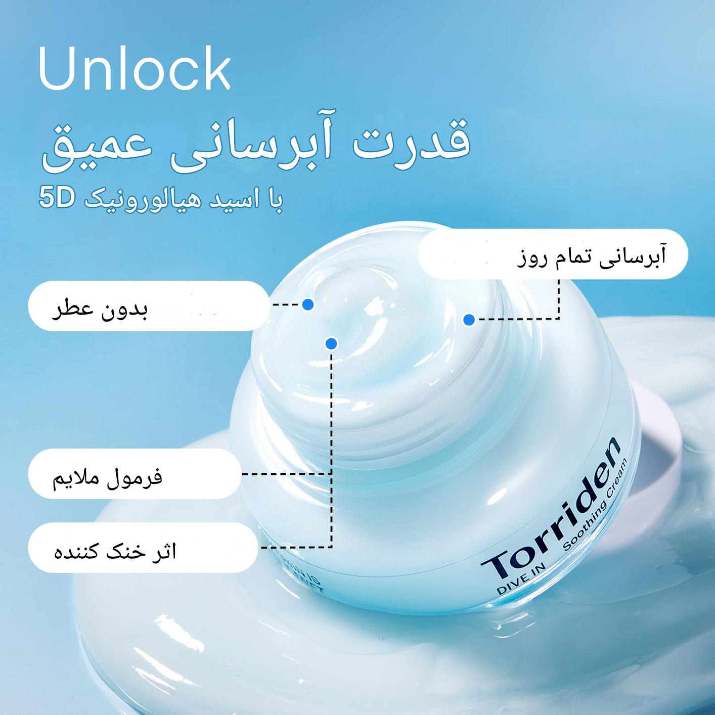 ژل کرم آبرسان و تسکیندهنده توریدن یک مرطوبکننده سبک اما فوقالعاده مؤثر است که با هدف احیای رطوبت پوست طراحی شده و مناسب پوستهایی با حساسیت بالا یا دهیدراته است. این محصول با استفاده از ۵ نوع هیالورونیک اسید (۵D هیالورونیک) ترکیب شده تا رطوبت را در لایههای مختلف پوست بهینه نگه دارد: مولکولهای سبکتر به عمق پوست نفوذ کرده و مولکولهای سنگینتر یک لایه مرطوبکننده سطحی تشکیل میدهند. بهعلاوه، این کرم حاوی پانتنول (ویتامین B5) و آلانتوئین است که نقش مهمی در تسکین پوست، ترمیم سد دفاعی و کاهش التهاب دارند.