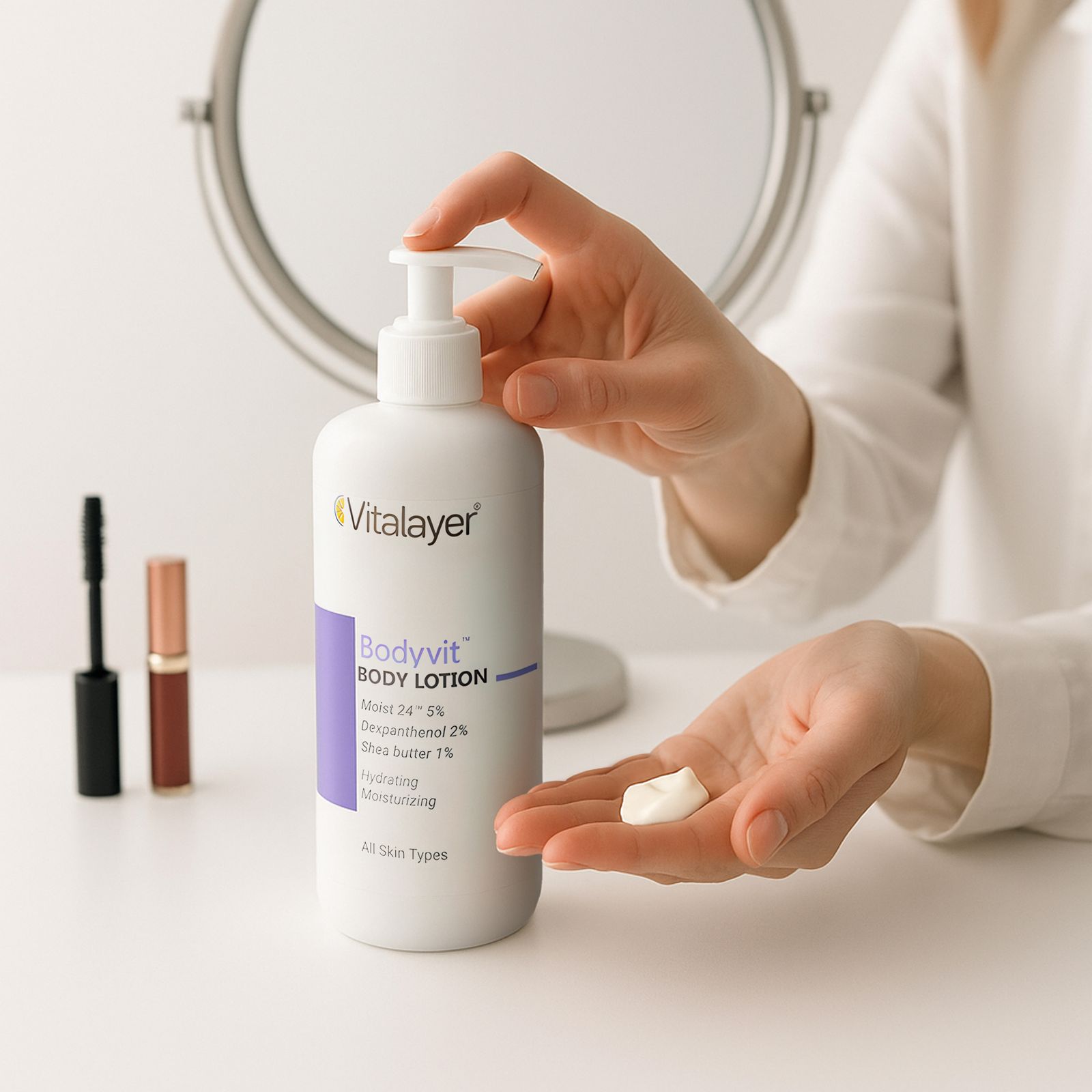 لوسیون بدن ویتالیر مدل Bodyvit با ترکیب پیشرفته Moist 24، دکسپانتنول و شی باتر، پوست بدن را عمقی آبرسانی کرده و تا ۲۴ ساعت نرمی و لطافت آن را حفظ میکند. این لوسیون سبک و بدون چربی، از خشکی و زبری پوست جلوگیری کرده و برای انواع پوست، بهویژه پوست خشک و حساس، مناسب است.
